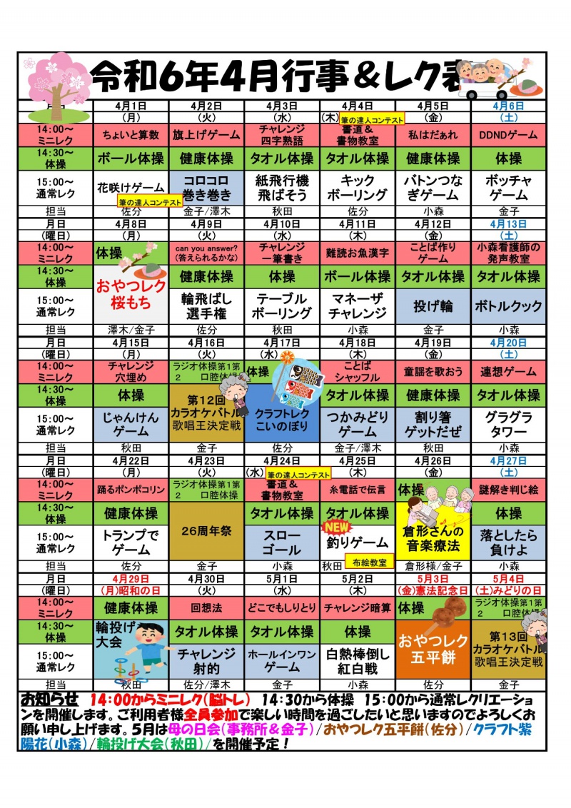 デイサービスセンター大野木 4/1 当月のレクリエーションも充実しています!