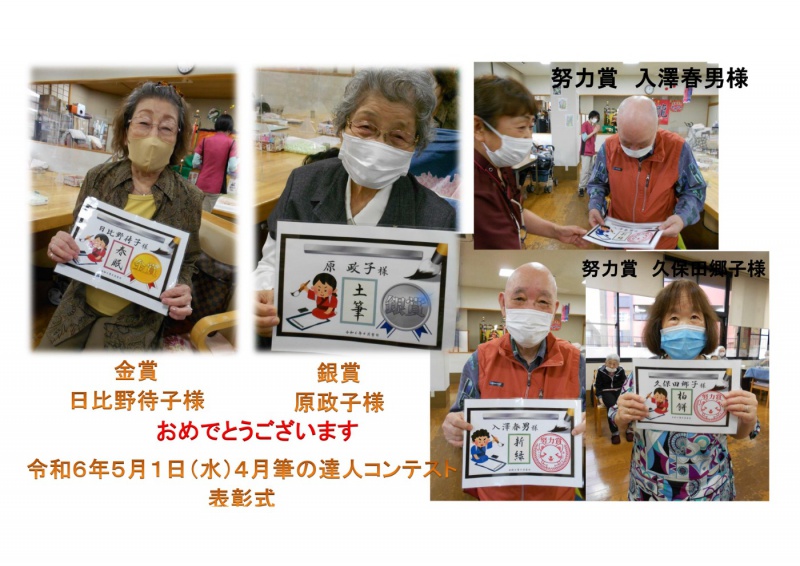 デイサービスセンター大野木 5/1 筆の達人コンテスト4月表彰式