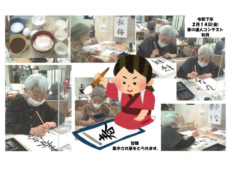 今月の月間企画として書道を実施しております。お題は「弥生」「桜餅」「ひな祭り」「卒業式」「春彼岸」「紅梅」。ご利用者の皆様真剣に取り組まれ、中には小学校以来だゎと仰られるご利用者様も挑戦されます!
