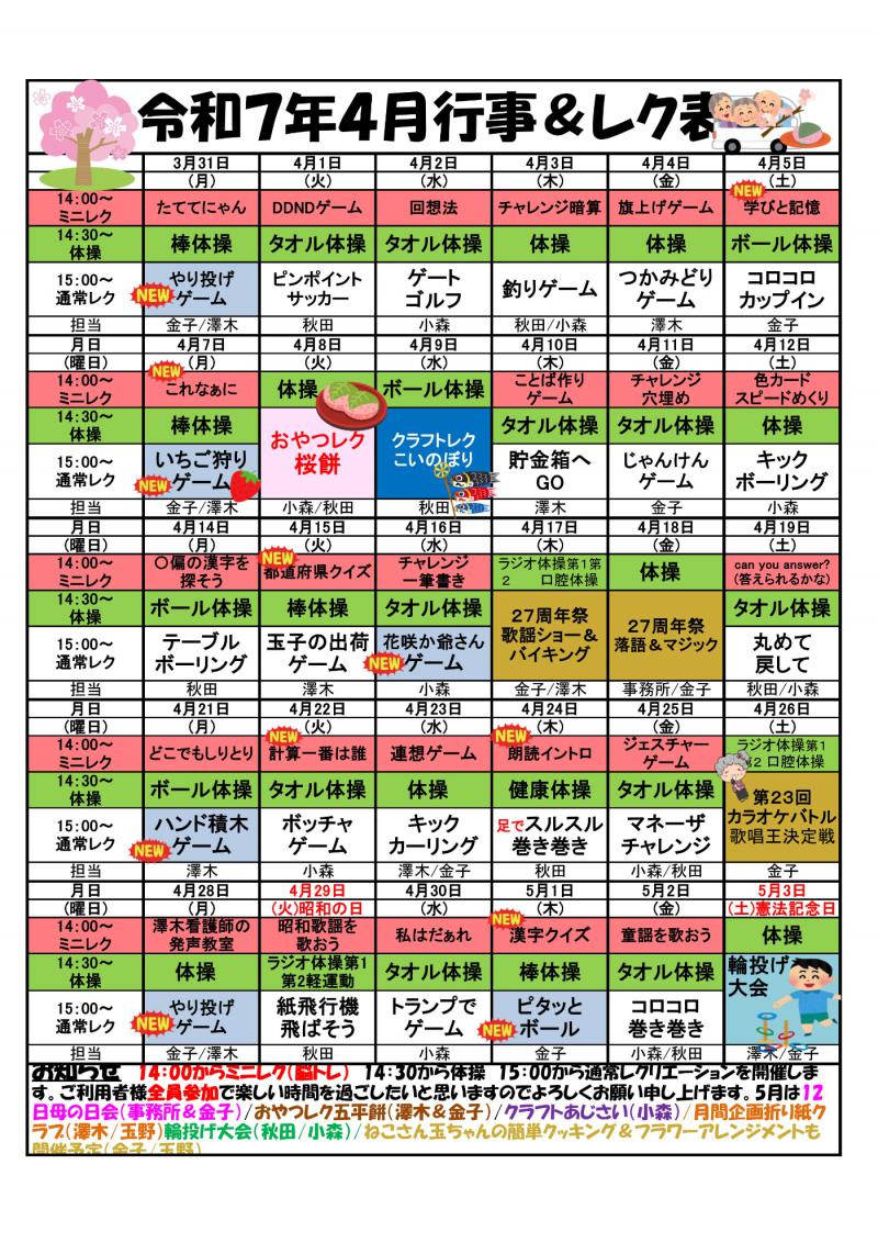 デイサービスセンター大野木 新規レク カップでビンゴ~4月レク予定