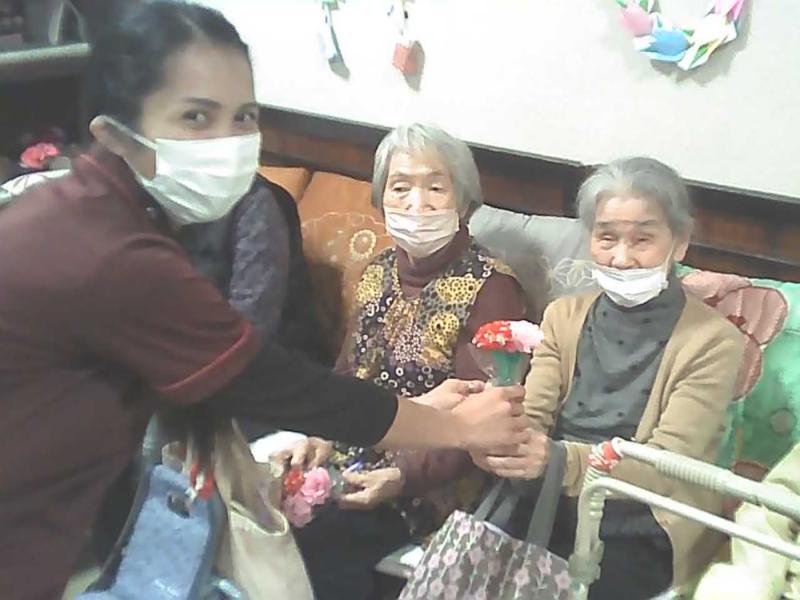 5/12(月)懐メロ楽座様をお招きし、歌唱会母の日会を開催いたしました。母の日にちなんだ歌を唄ったり楽しいひとときを過ごしました。また帰宅前の終礼ではカーネーションの花束をプレゼントさせていただきました!皆様 大喜びで笑顔いっぱいでした!