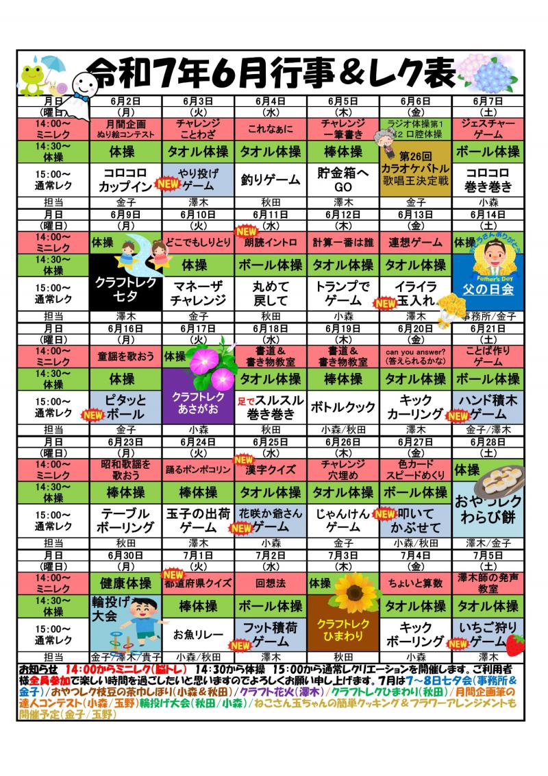 6月は父の日会にEWI鑑賞会、おやつレクはわらび餅、クラフトも七夕や朝顔、輪投げ大会にカラオケバトルと楽しんでいただける内容となっております。今月もよろしくお願いいたします!
