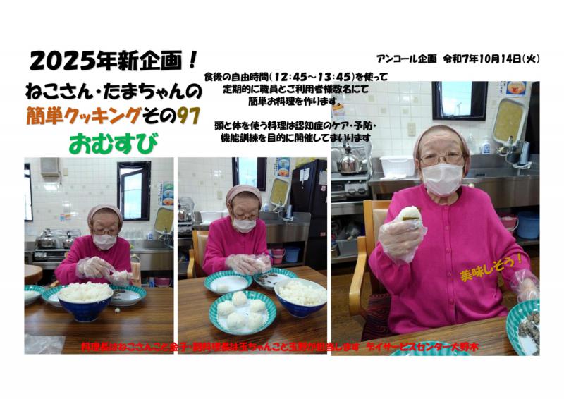 デイサービスご利用前は飲食店をされておられ形良いおむすびを作られました。初挑戦で笑顔満開でした。ご本人様のコメントは「大勢に美味しいと言われうれしかった」この機会に機能向上にお役立ちできたらと思います。