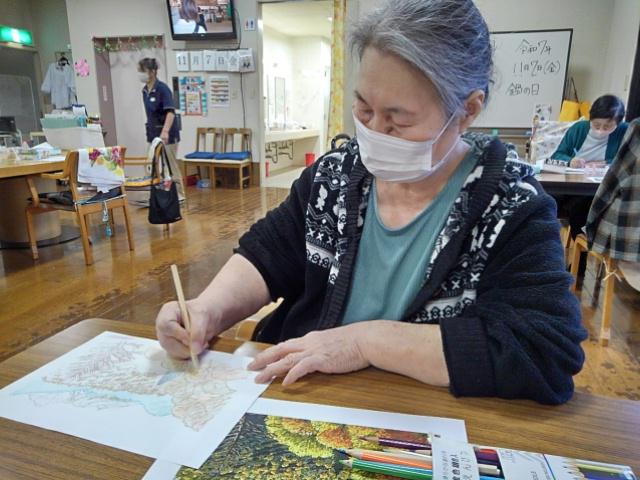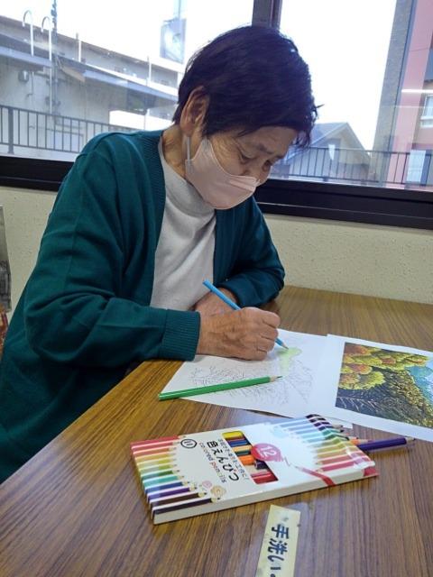 11/5より秋紅葉をテーマに塗り絵コンテストを開催しております。全員参加の中各自色鉛筆で腕を振るっておられます。少し難しいかな?金賞を目指し頑張りましょう!
