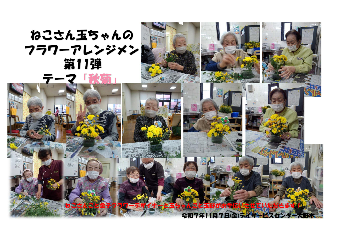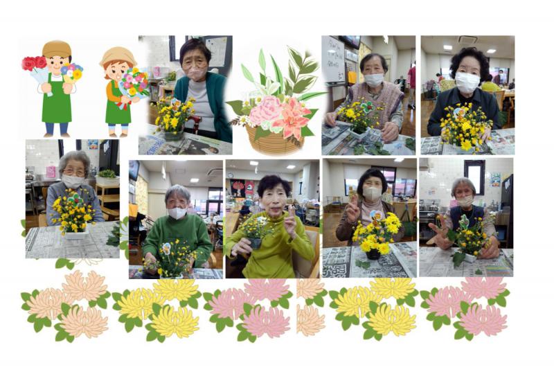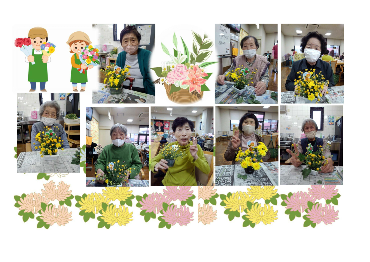 稲垣様にたくさんの菊をいただきましたので、フラワーアレンジメントを開催いたしました。元気が出る黄色の花に、出来栄えに皆様大喜びでした。稲垣様ありがとうございました。