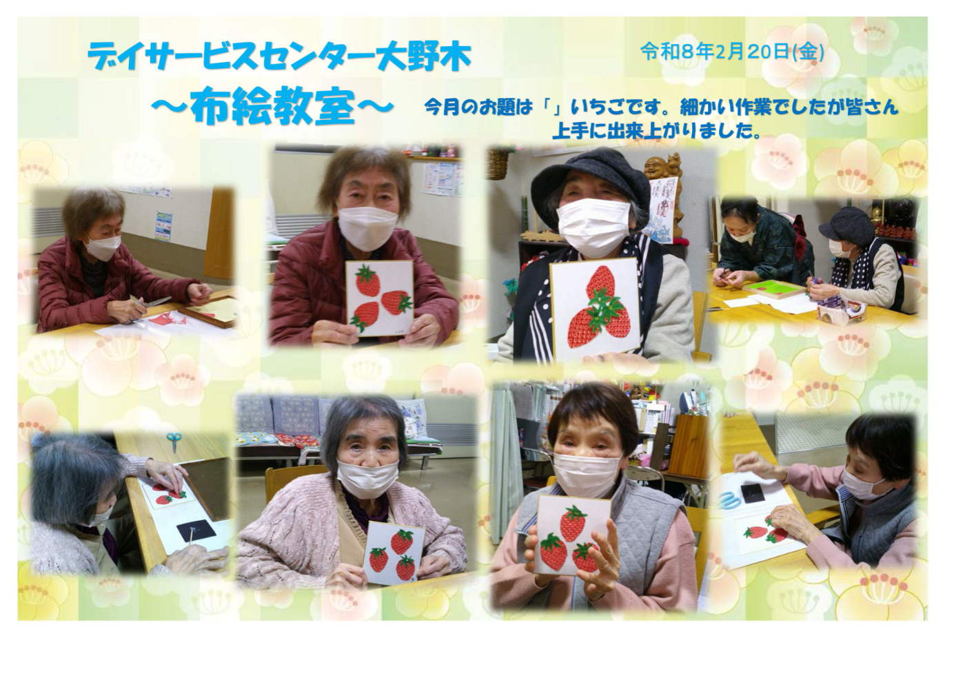 ボランティアの後藤先生いつもありがとうございます。本日は旬のテーマのいちごを布で作ってみました。難しいと言われつつも出来栄えに満足のご様子でした。