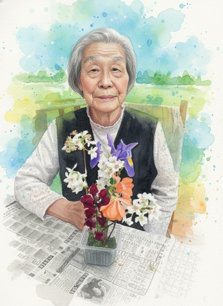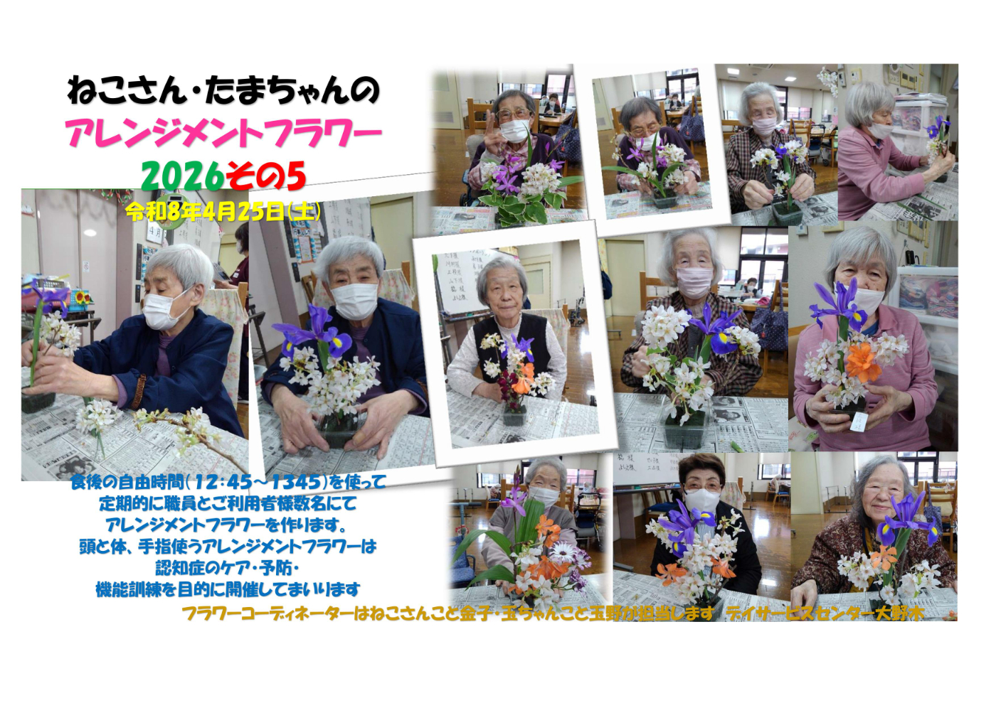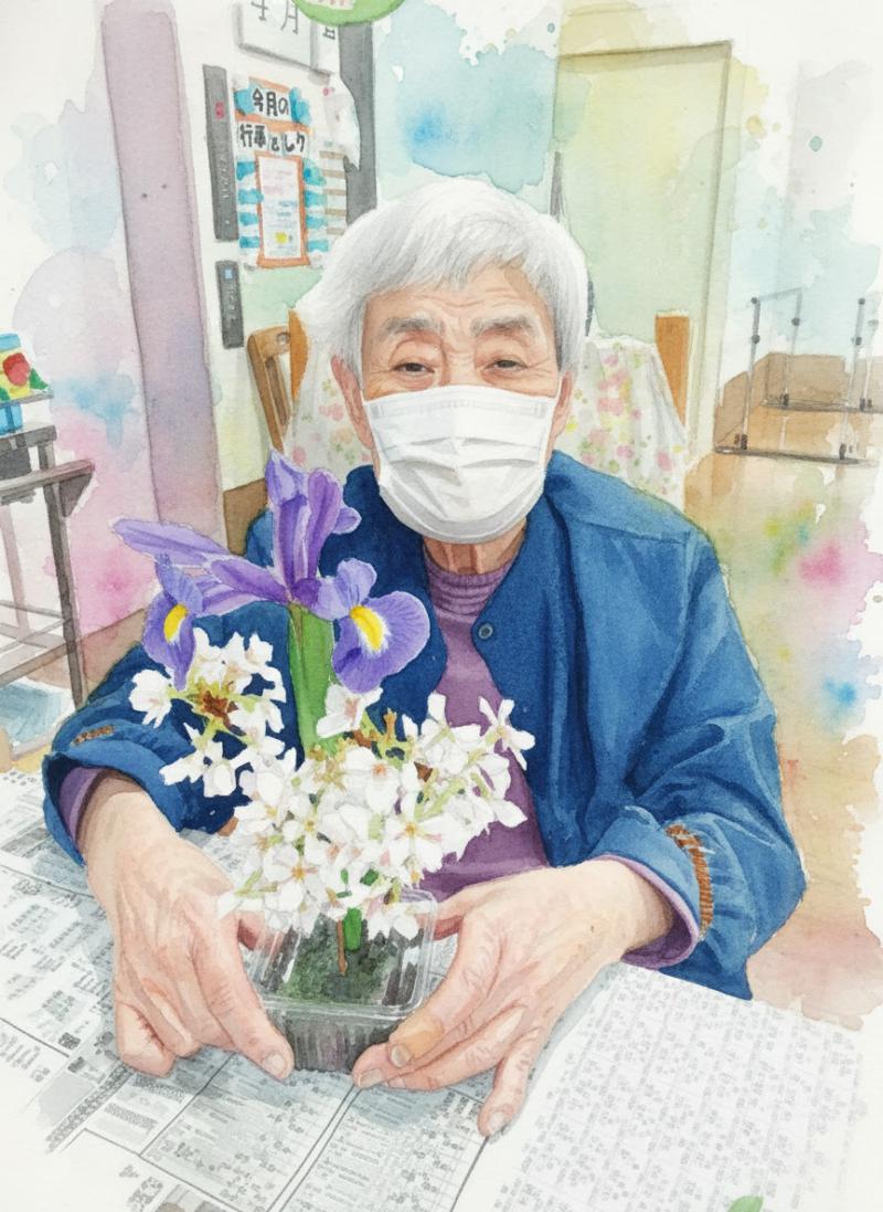 ご利用者様ご家族様より桜をいただきましたので、旬のあやめといっしょにフラワーアレンジメントをいたしました。参加ご利用者様は大満足!ありがとうございました。
