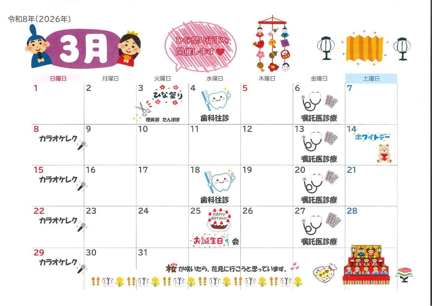 3月3日は、ひな祭り行事を開催しました。 ひな祭りゲームを楽しみ、記念撮影もしました♪ おやつには、ひなあられ、ロ...