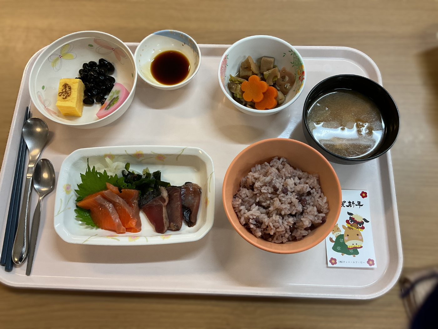 元日の昼食です。 ~メニュー~ ・お刺身 ・野菜の炊き合わせ ・おせち盛り合わせ ・赤飯風小豆ご飯 ・味噌汁 1月2日の昼食は「てんぷらの盛り合わせ」1月3日の昼食は「ちらし寿司」でした。 正月三が日は、お正月らしい少し豪華なメニューに、皆さん「いいねぇ」と喜ばれていました♪