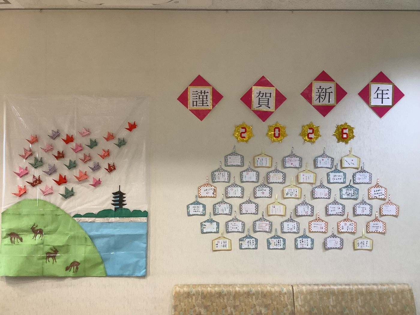 エントランスホールの壁面飾りです。 季節ごとに変わりますが、現在は、皆さんの絵馬が飾られています。 思い思いの願いが込められています。 面会の際には、是非ご覧ください。