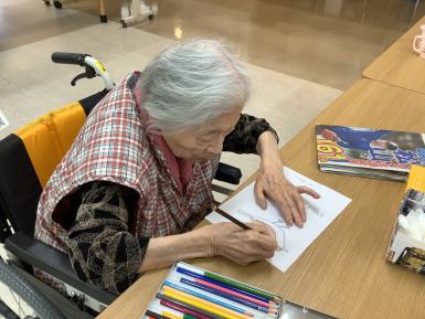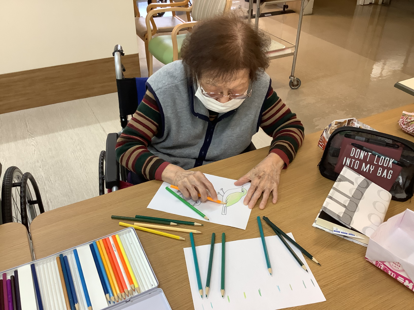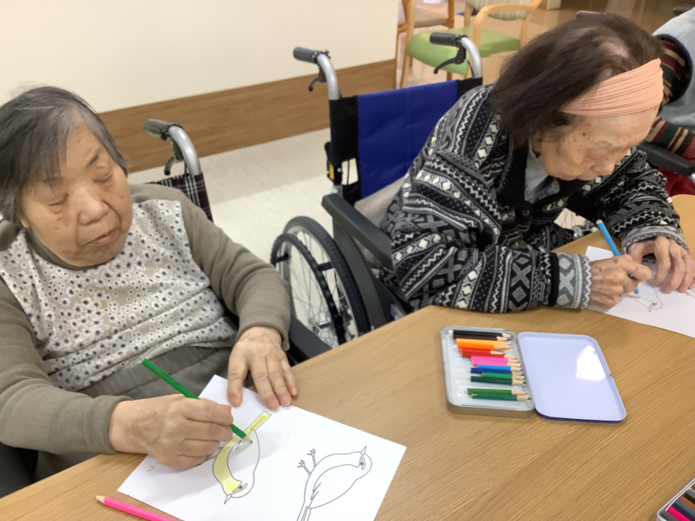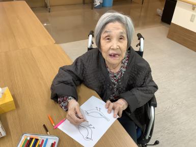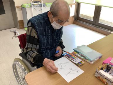 玄関の壁面飾り、冬versionです。 うぐいすは、皆さんに協力して頂きました。 思い思いの色で塗ってくれました。色とりどりのうぐいすがキレイですよね♪ 職員と入所者様との合作になりました。