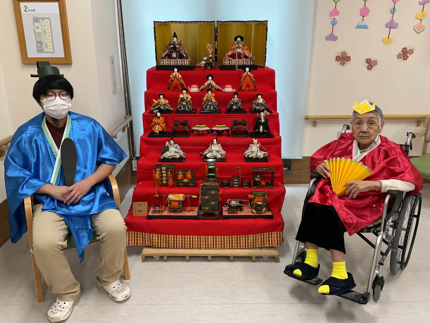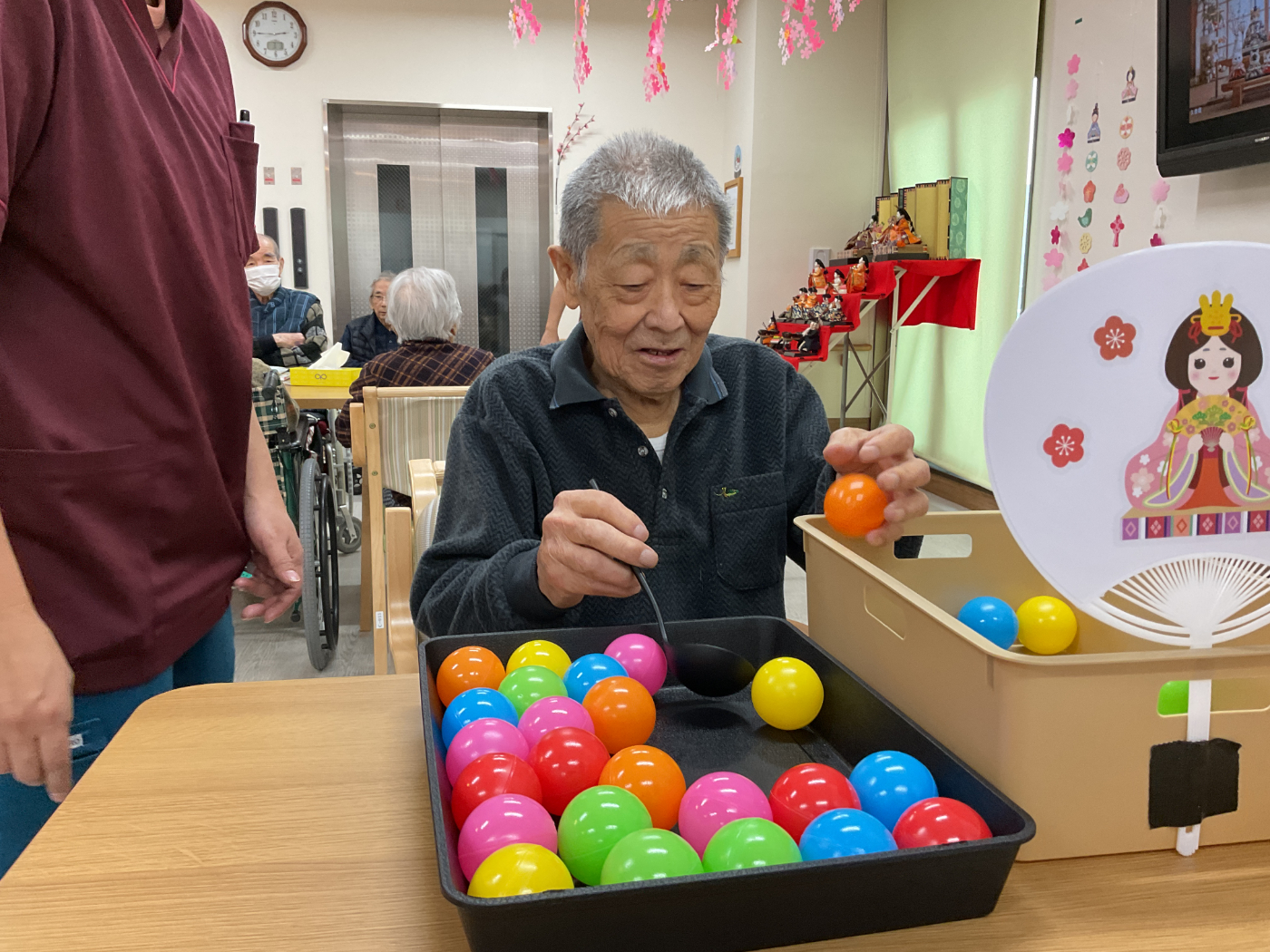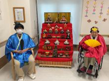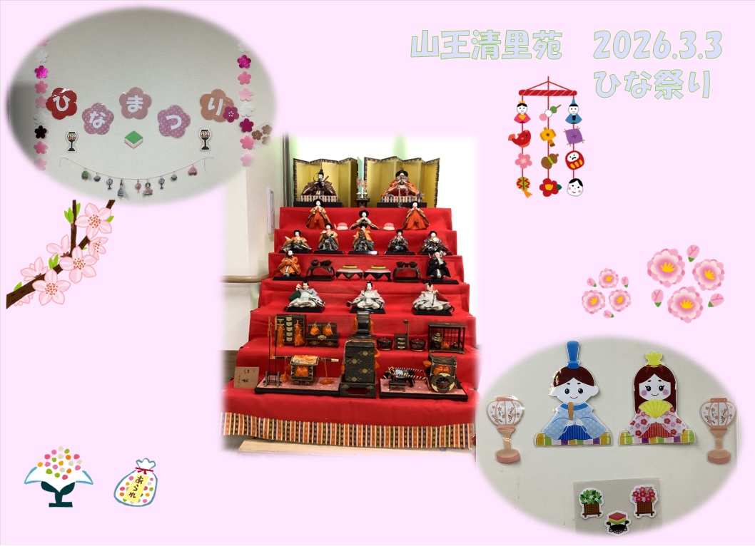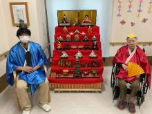 3月3日は、ひな祭り行事を開催しました。 ひな祭りゲームを楽しみ、記念撮影もしました♪ おやつには、ひなあられ、ロールケーキ、甘酒を召し上がって頂きました。 「ひなあられ、美味しい」や「甘酒はめったに飲めないから、いいね」と皆さんに楽しんで頂けたのではないかと思います。 七段飾りのひな人形も、最近ではめったに見かけなくなりました。今後も大切に保管し、毎年皆さんと楽しめるといいなと思っています。
