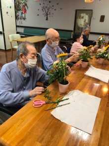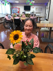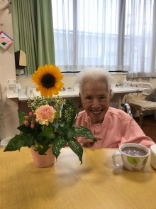 ヒマワリを中心に夏らしい元気なお花が出来ました。皆さん真剣な表情で作品を作っていました。初めてアレンジメントを作る方も初めはできるかなと不安そうにされていましたが、見本を見ながら自分らしく楽しそうに活けることが出来て良かったです。