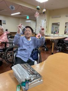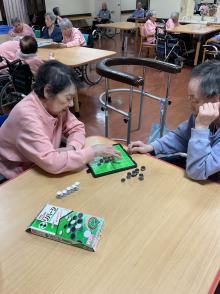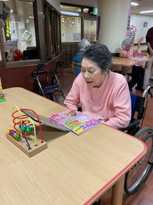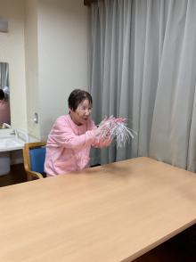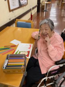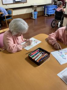 塗り絵を塗ったり、ポンポンを付けて踊ったり、ゲームをしたりレクリエーションを楽しんでいます。