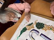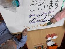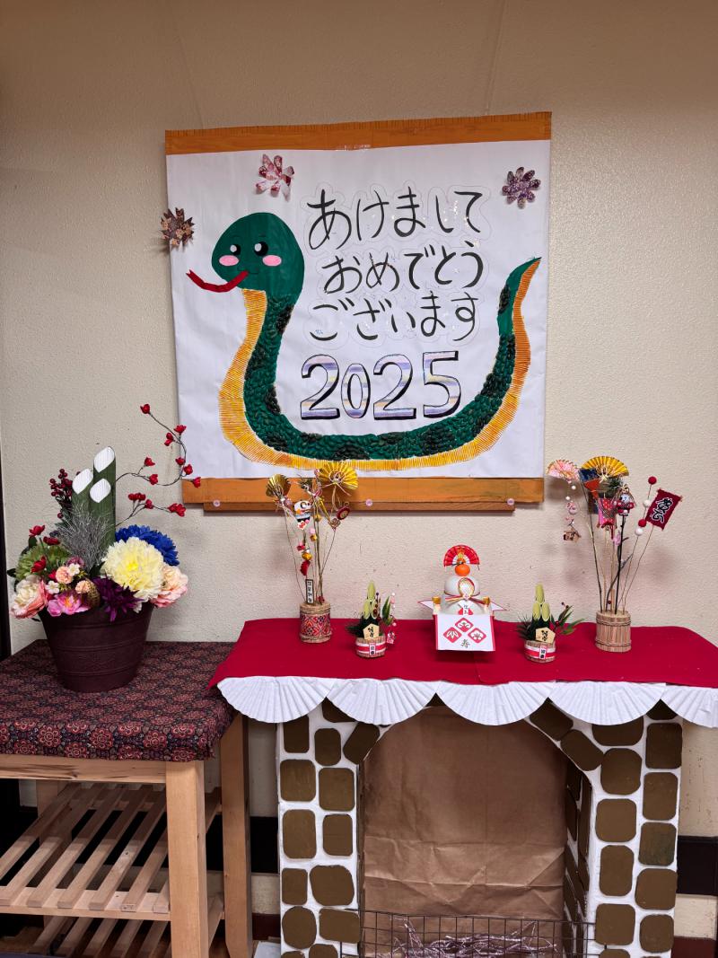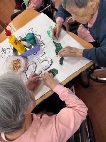 皆で干支の壁画を作りました。今年の干支は蛇!スタッフが一生懸命ピスタチオを食べ殻をたくさん集めリアルな蛇のうろこ感にこだわった作品になりました。皆さん真剣にピスタチオの殻を並べ最後に緑のペンキを塗りました。お腹の部分はお菓子の梱包材を使いました。出来上がりを見て「すごいなー、ヘビだ!」と作品の出来に歓喜されました。