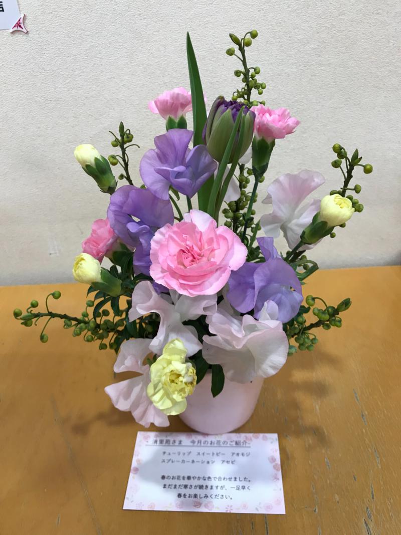 春のお花(チューリップ・スイトピー・アオモジ・スプレーカーネーション・アセビ)を華やかな色で合わせました。まだまだ寒さが続きますが、一足早く春をお楽しみください。~小川屋園芸~