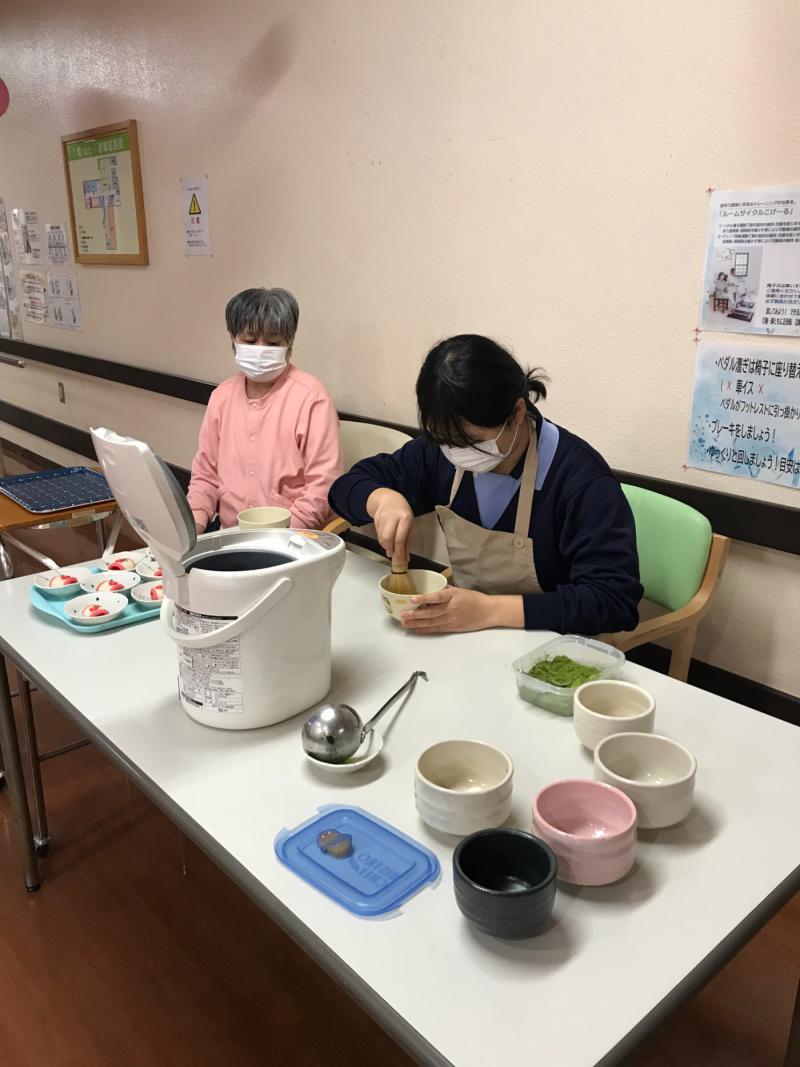 新年初営業の喫茶にて入所者様のお孫さんがボランティアに来てくれました。学校の部活で茶道部に入っているということでお抹茶スペースを用意しました。隣ではおばあちゃんが見守りながら「孫が点てたお抹茶です。どうぞ」とお運びさんを手伝ってくれました。新年を祝ってかわいらしい和菓子とコーヒーやお抹茶を楽しみました。