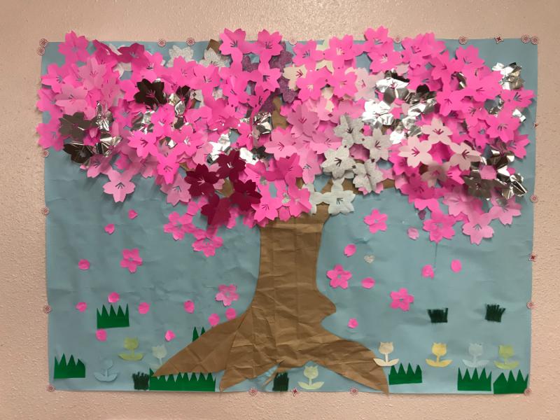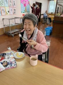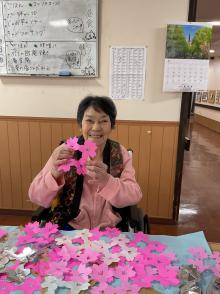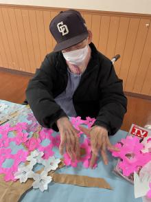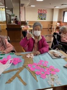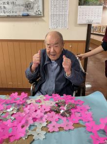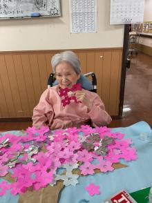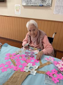 今日は3月の誕生日の方を皆さんでお祝いしました。皆さんに手伝ってもらい桜の飾りを貼りつけてくと大きな桜の木が満開になりました!春を感じる素敵な作品が出来上がりました。待っている間にはカラオケを歌い楽しい時間が過ごせました。おやつには手作りロールケーキが提供されとても好評でした。