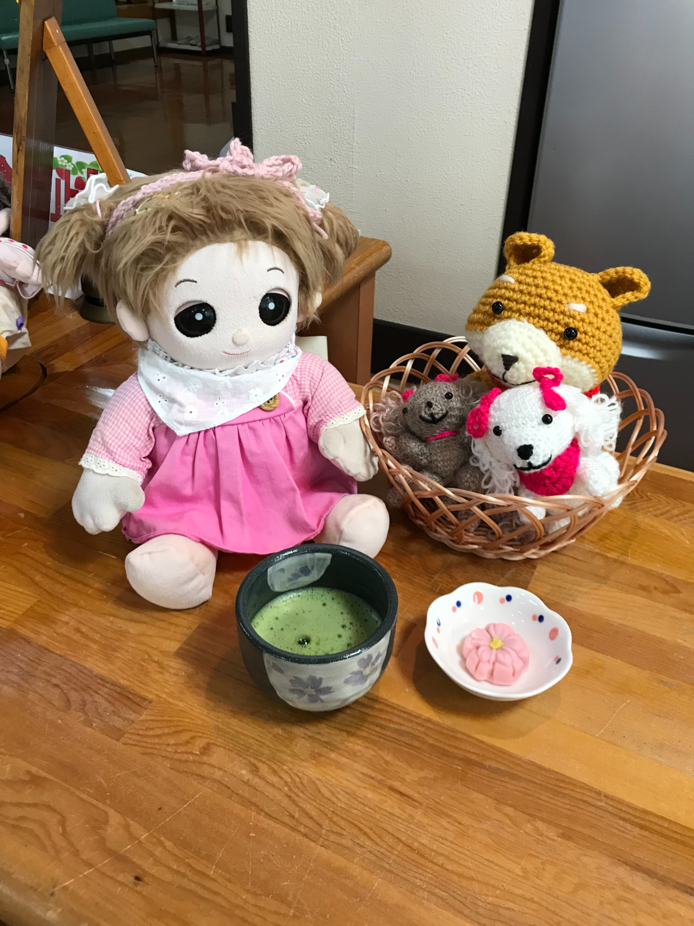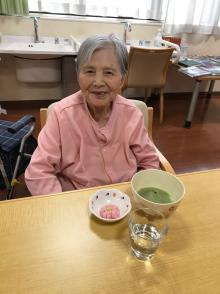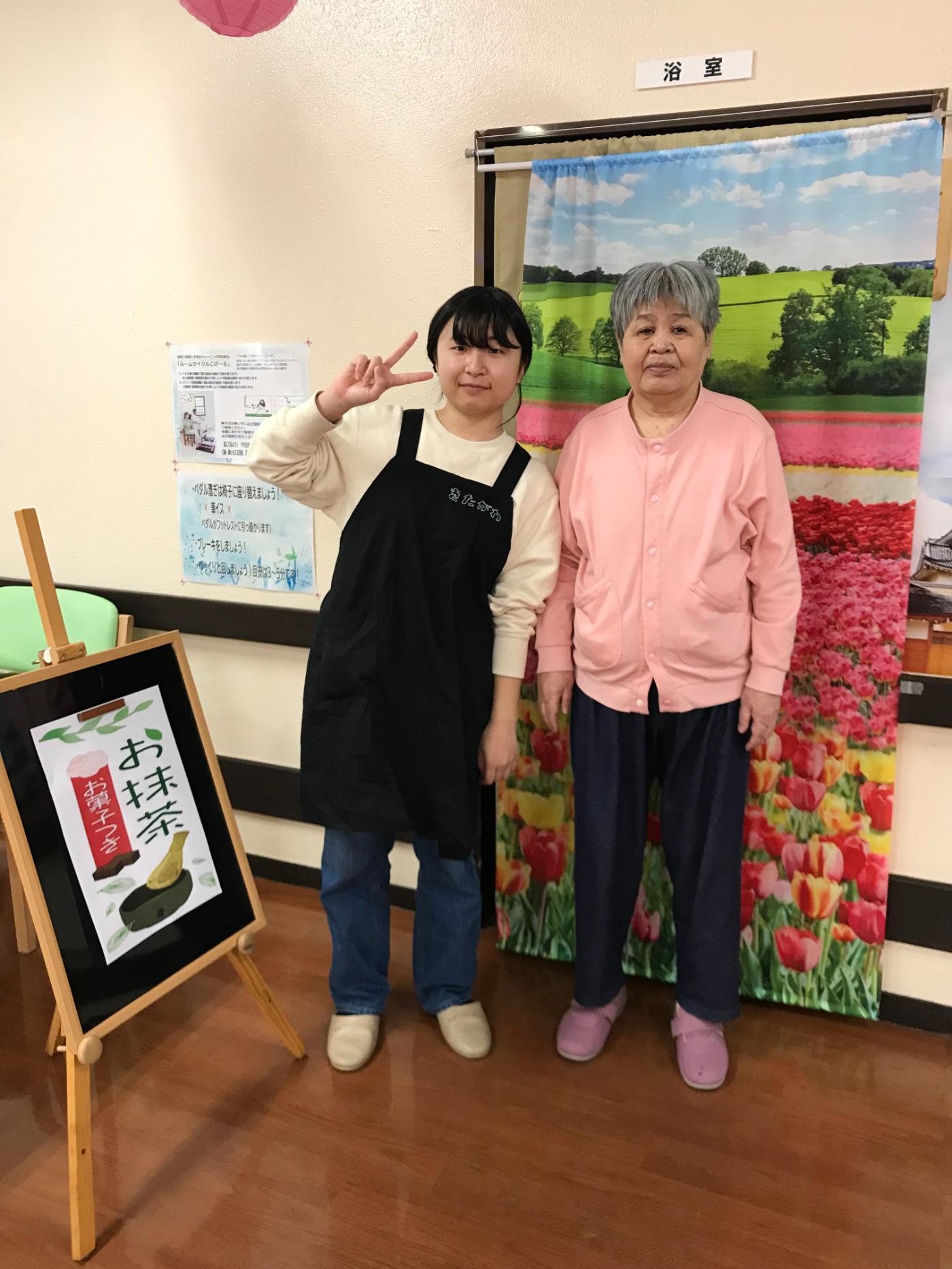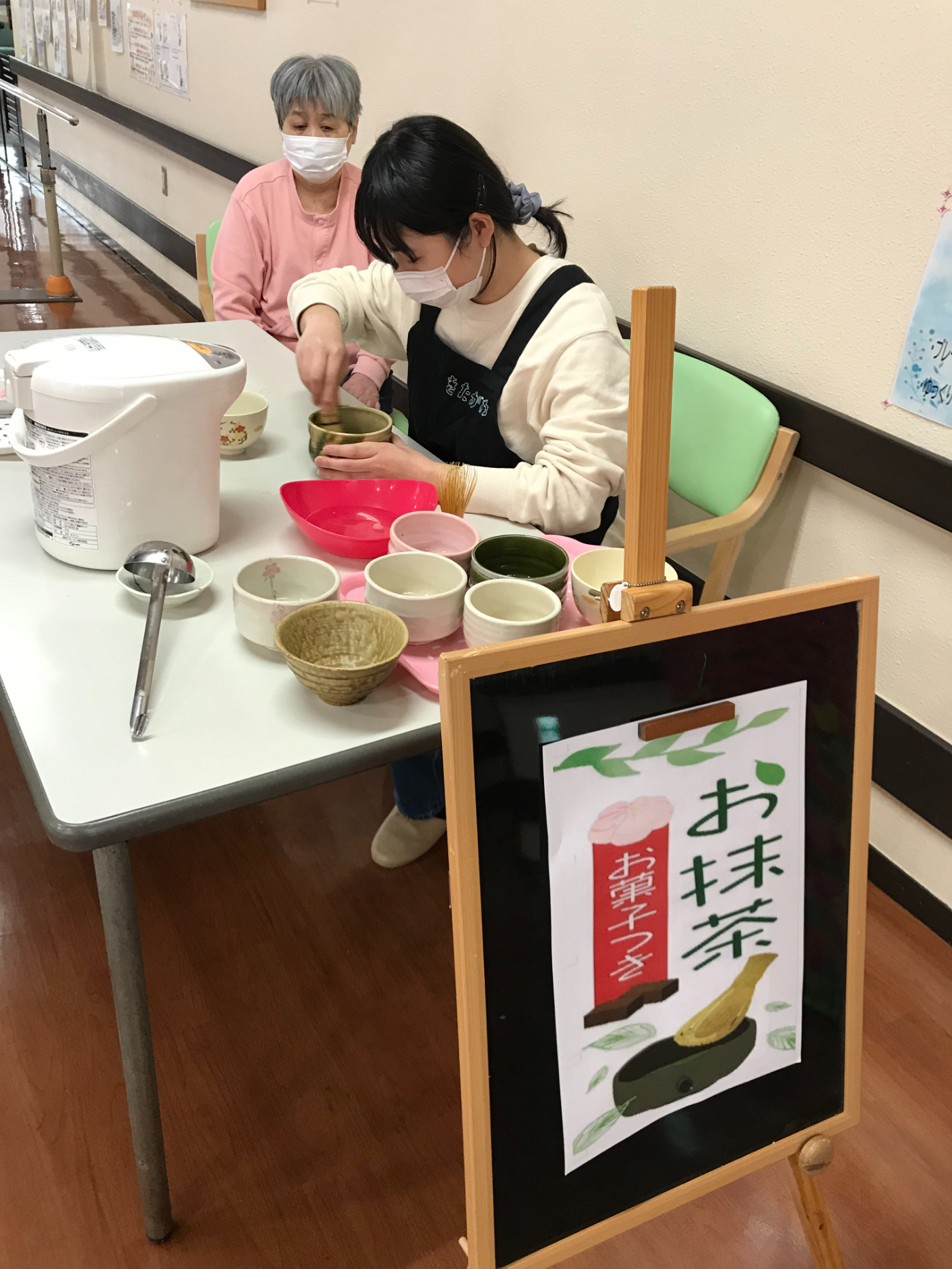 入所者様のお孫さんが春休みにボランティアに来てくれています。学校で茶道部に入っていると聞いたので希望される方にはお抹茶を点ててもらいました。久しぶりにお抹茶飲めて嬉しいと好評でした。またかわいい桜の花の和菓子がコーヒーの方にも抹茶の方にも春を感じてもらえました。清里苑の前の公園の桜もきれいに咲き始め今度は本物の桜を楽しみに公園に出かけましょう!