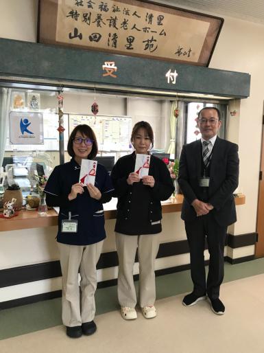 20年表彰3名、10年表彰2名のお祝いが行われました。たくさんの方が長く勤めているアットホームな施設です。入所者さんが笑顔で生活できるようにこれからも支援していきます!と皆さん意気込みを見せてくれました。