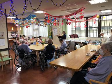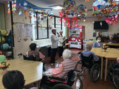 今日は恒例になってきましたがナイスガイズの演奏会を行いました。皆さん楽しみにされていてたくさんの方が音楽とお話を楽しまれました。次回は岡晴夫さんの歌を入れて欲しいと要望もありましたので、次回を楽しみにしております。職員の安西さんのフルート演奏に合わせて皆さん声を出して歌を歌って楽しまれる姿もみられ良い時間が過ごせました。