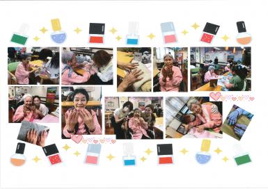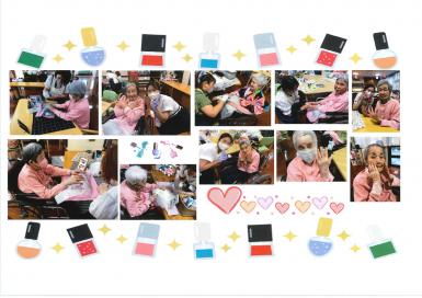 前回のメイクアップボランティアに続きまして今回はネールアートのボランティアの皆さんが来てくれました。手のマッサージをしてもらって好きな色のマニキュアを塗ってもらい可愛いらしいハートやお花のイラストを入れてもらうと皆さんとっても嬉しそうに出来上がりの爪を見ていました。爪を明るく塗ることで気分も明るくなり皆さん素敵な笑顔が見られました。