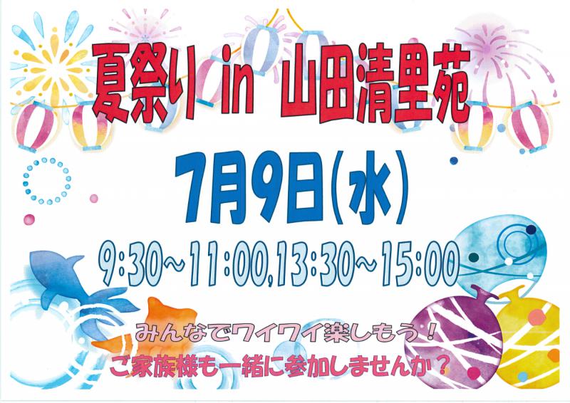 7月9日(水)1部9:30~11:00 紙芝居、ゲーム、屋台 2部13:30~15:00 盆踊り、ゲーム、屋台 家族の皆さんも一緒に参加しませんか?参加希望の方は施設まで連絡下さい。