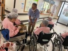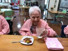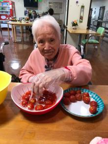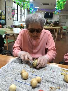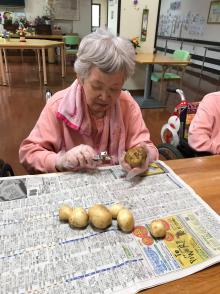 収穫したジャガイモを使っておやつを作りました。ジャガイモの皮をむいたり、プチトマトの皮を湯むきしたりしっかりと手先を使うことができ良い機能訓練にもなりました。