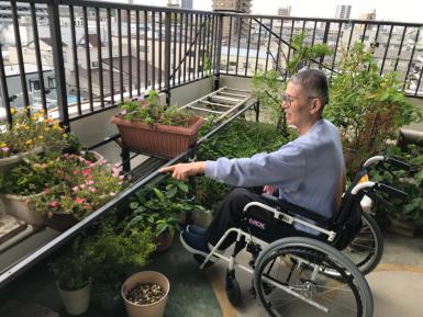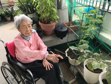山田清里苑の屋上には庭園や季節のお花や野菜があります。入所者様と一緒に屋上庭園の散歩を楽しんだり、屋上から見える景色を楽しんだり気分転換を図りました。