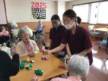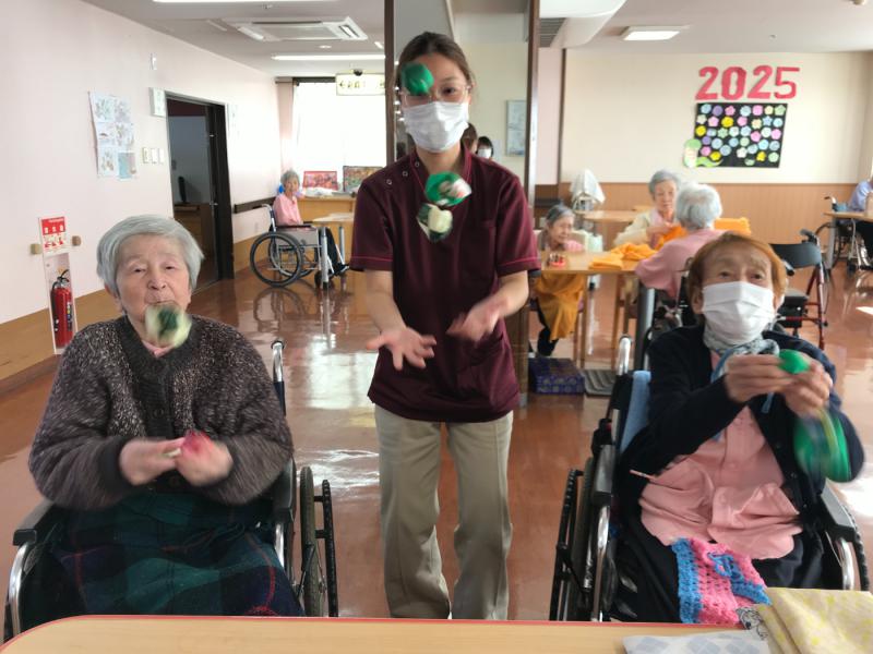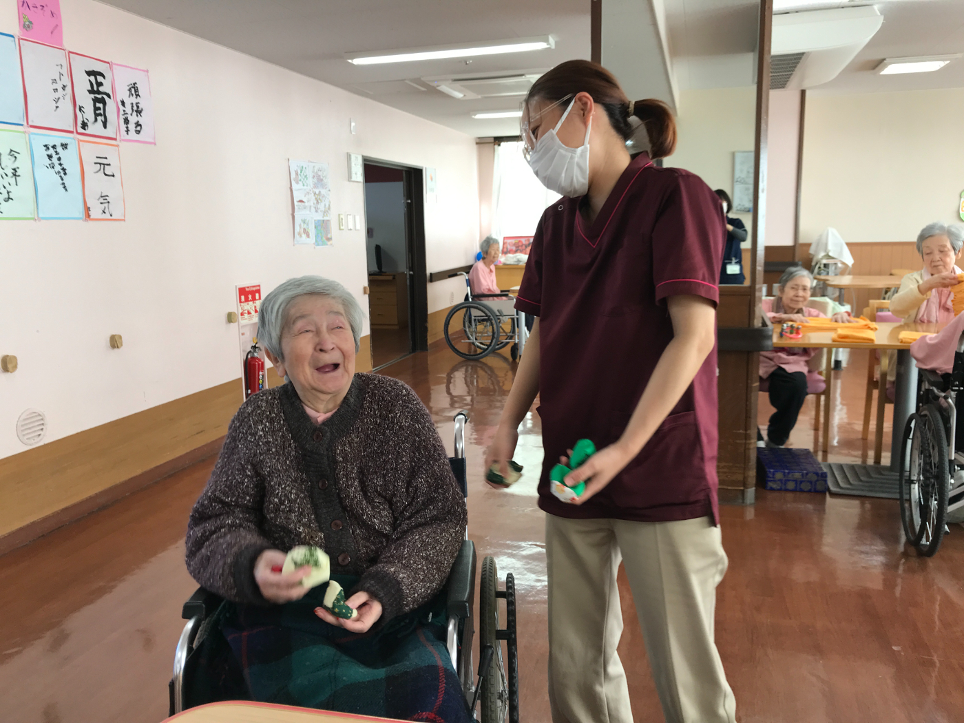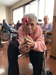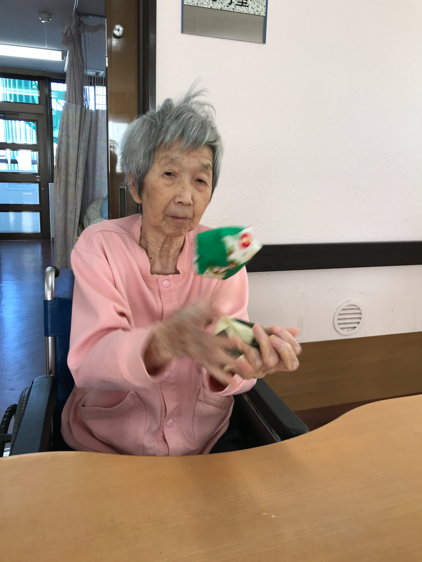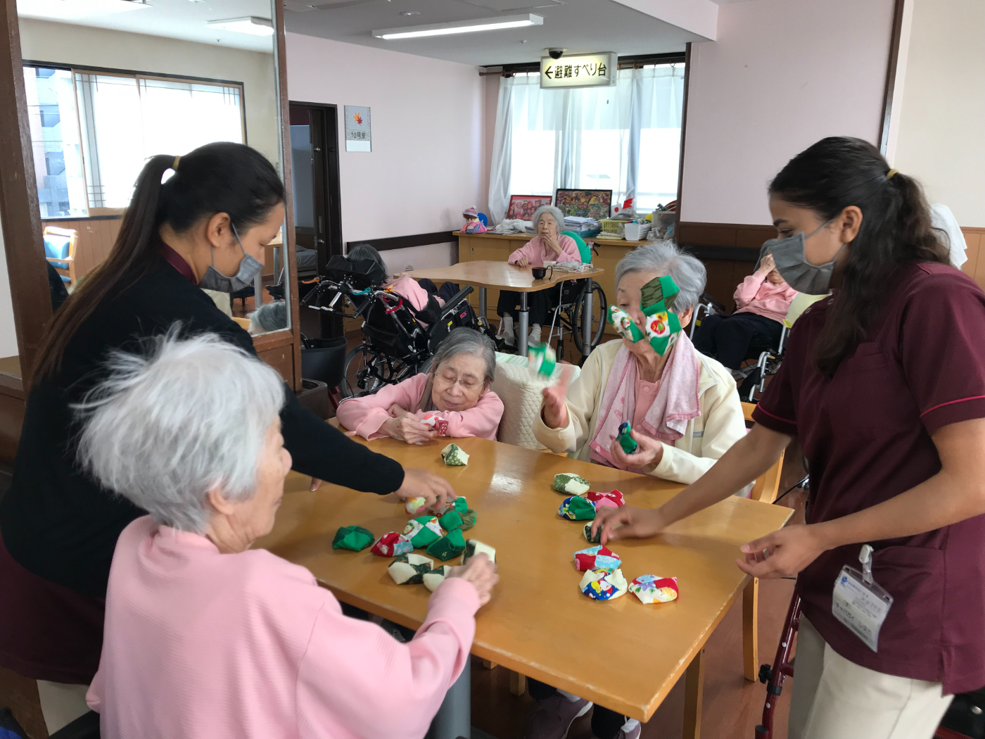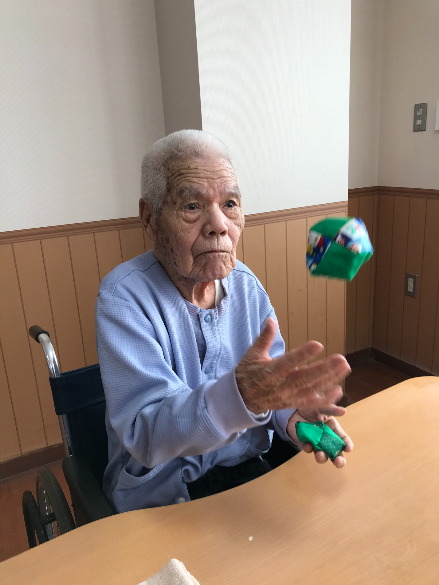 ご家族様から頂いたお手製のお手玉で「一かけ二かけ三かけて」の一つお手玉を上に投げている間に1つ、2つ、3つととるゲームをしました。するとなんとネパール人スタッフが「私たちも石で子供の頃やってた!」と上手に披露!そしたら続いてベトナム人スタッフも「私もレモンと箸で同じのやってた!」と盛り上がりました。異文化でも子供の遊びは共通なんだと実感しました。たくさんの方がお手玉をもって童心に返り楽しみました。