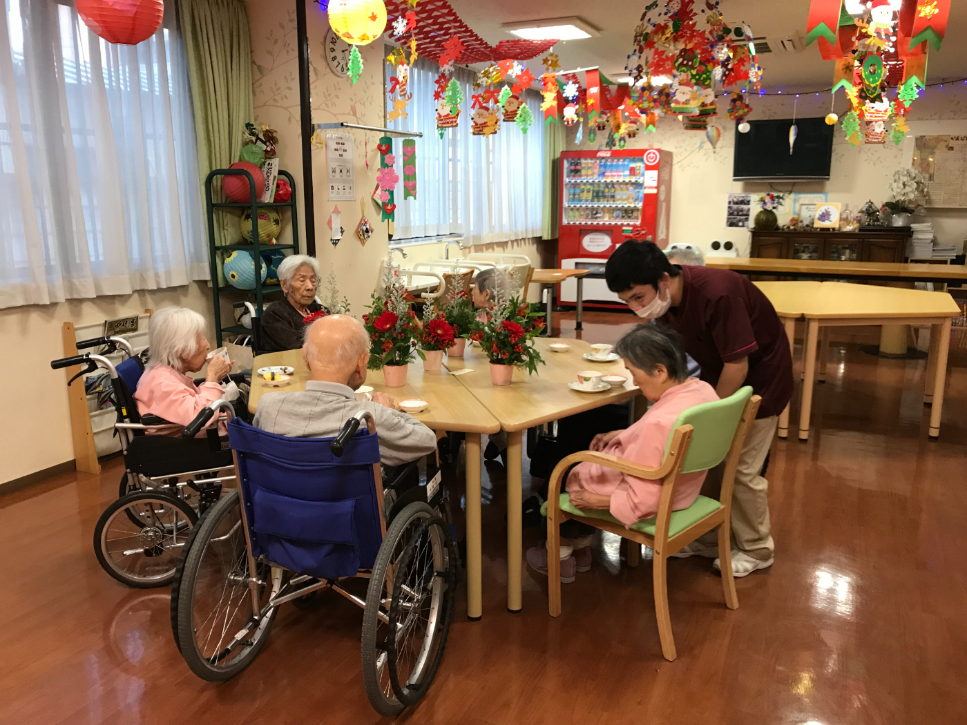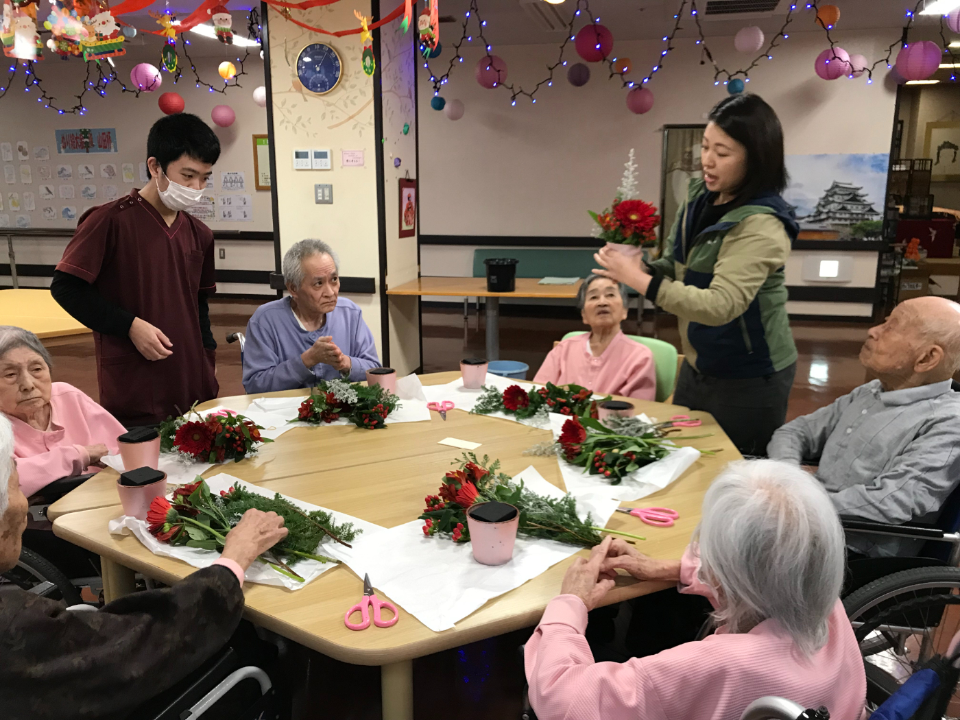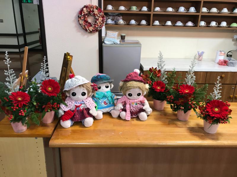 先生が今日のお花を持ってきた時に大きくて真っ赤なガーベラがとても綺麗で皆さん「わー素敵だね!クリスマスみたい」と言われ、先生の説明を受けながらセンス良くアレンジメントを完成させるとそれぞれ自分の作品に満足されお花を囲んでおいしいコーヒーを楽しみました。秋があっという間に過ぎもう冬なんだね!と実感しました。