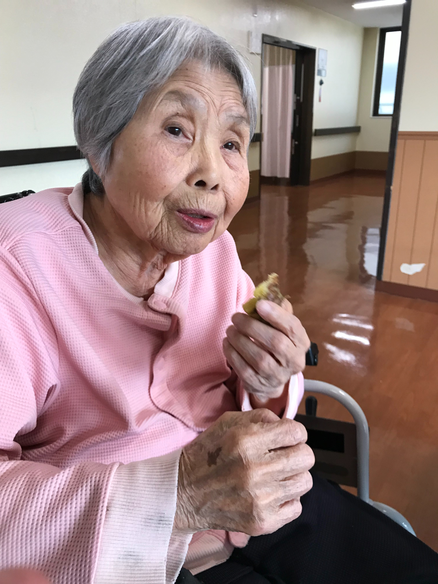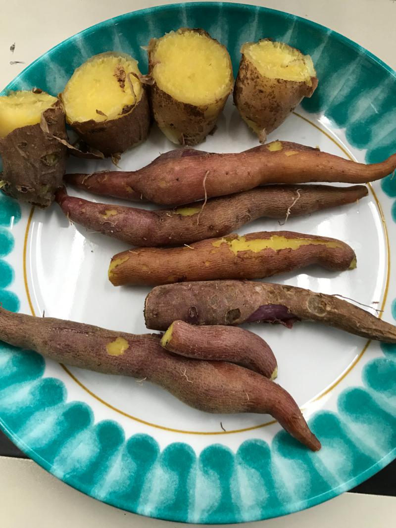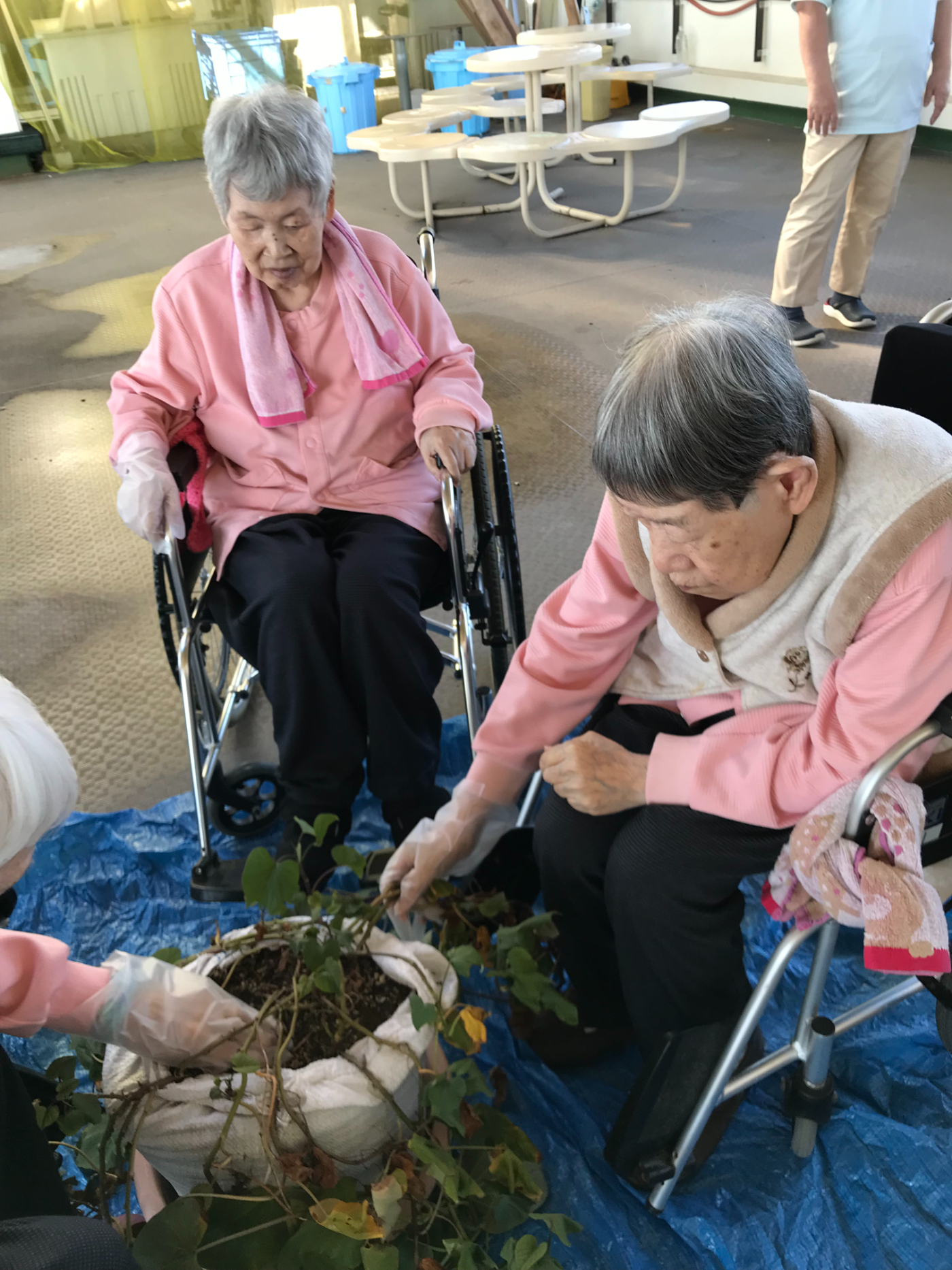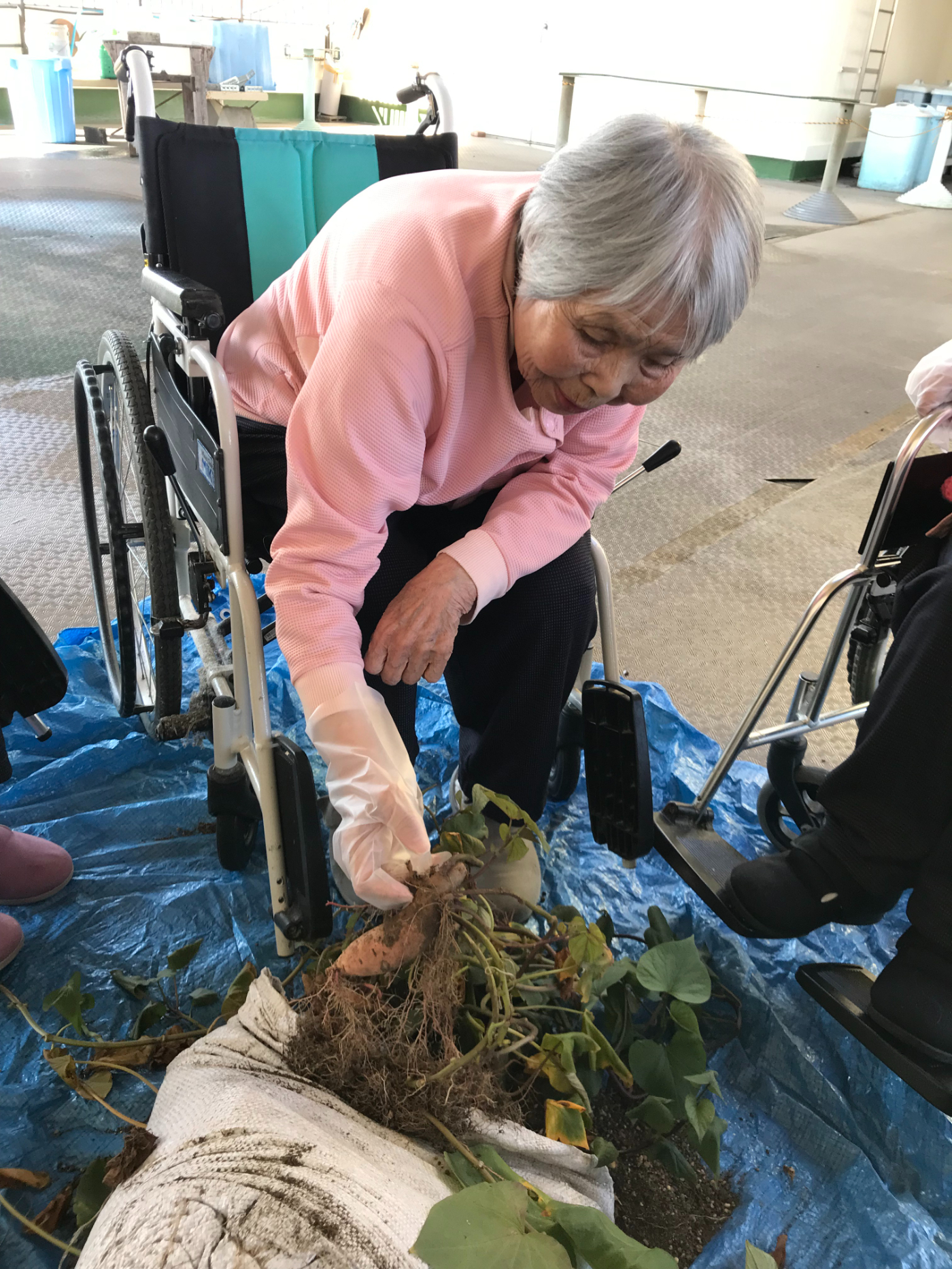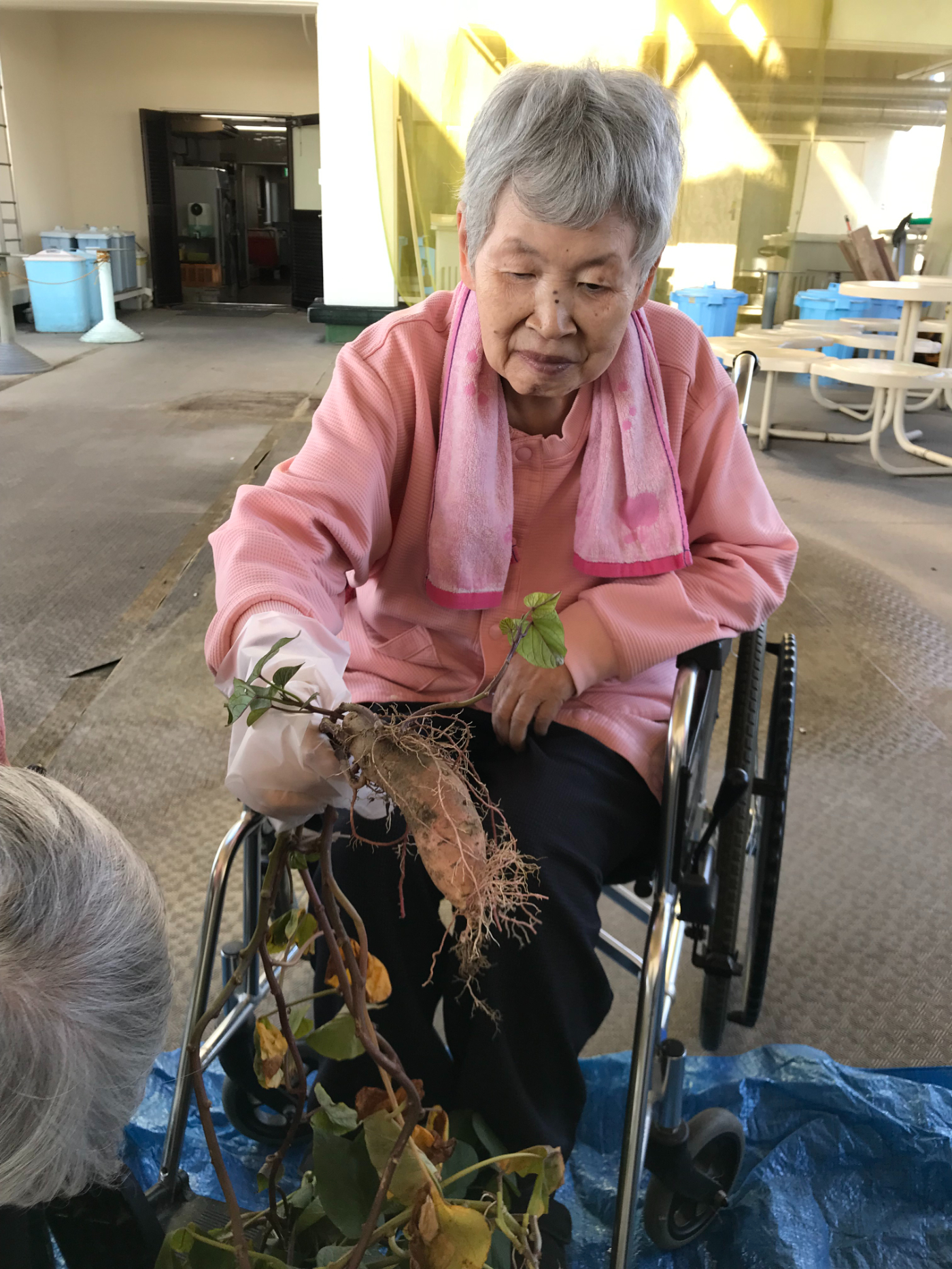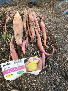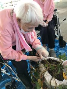今日は天気も良く暖かかったので屋上へ芋ほりに出かけました。皆さん気合を入れてお芋を探しましたが小さなお芋が少しみつかりちょっと残念と思っていたら「天気もいいしみんなでこんな事が出来て楽しいよ」と前向きな言葉を頂きホッとしました。でも小さくてもきっと甘いよね、少ないからみんなで食べようね!と厨房で蒸してもらいおやつの時に持っていくと「美味しいよ!小さくても甘いよ」と好評でした。