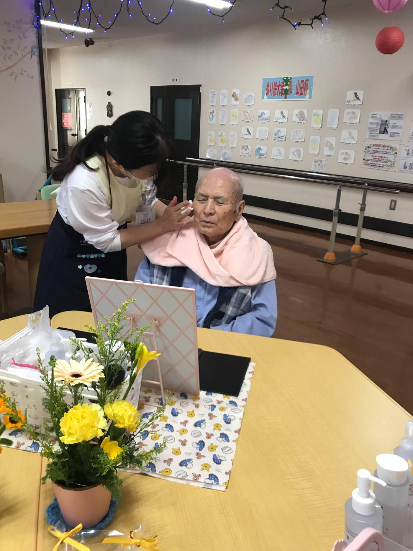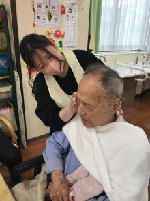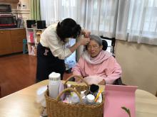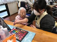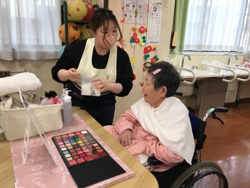 今回もたくさんのボランティアさんが入所者様にメイクをしてくれました。今回は面会に来ていた男性陣もご家族と一緒にスキンケアをしてもらい気持ち良さそうにしていました。ご家族も動画を回されたり写真を撮ったりしながら普段は見られない表情なども見られ楽しまれたようです。女性陣も久しぶりのメイクに目をキラキラさせながらアイメークや口紅など好きな色を選んでいました。出来上がると皆さん満足そうに「綺麗になったね」と笑顔で記念撮影を行いました。