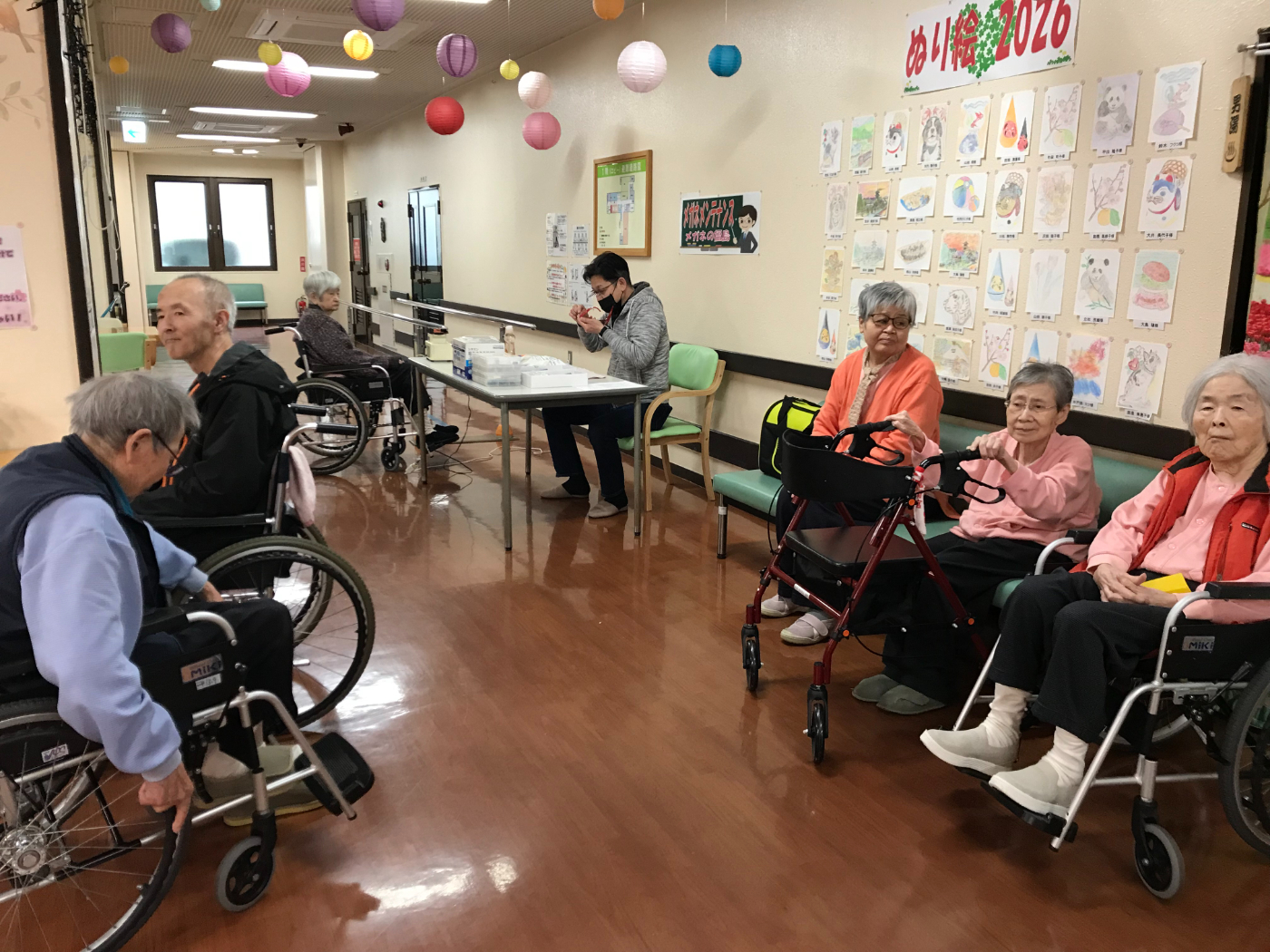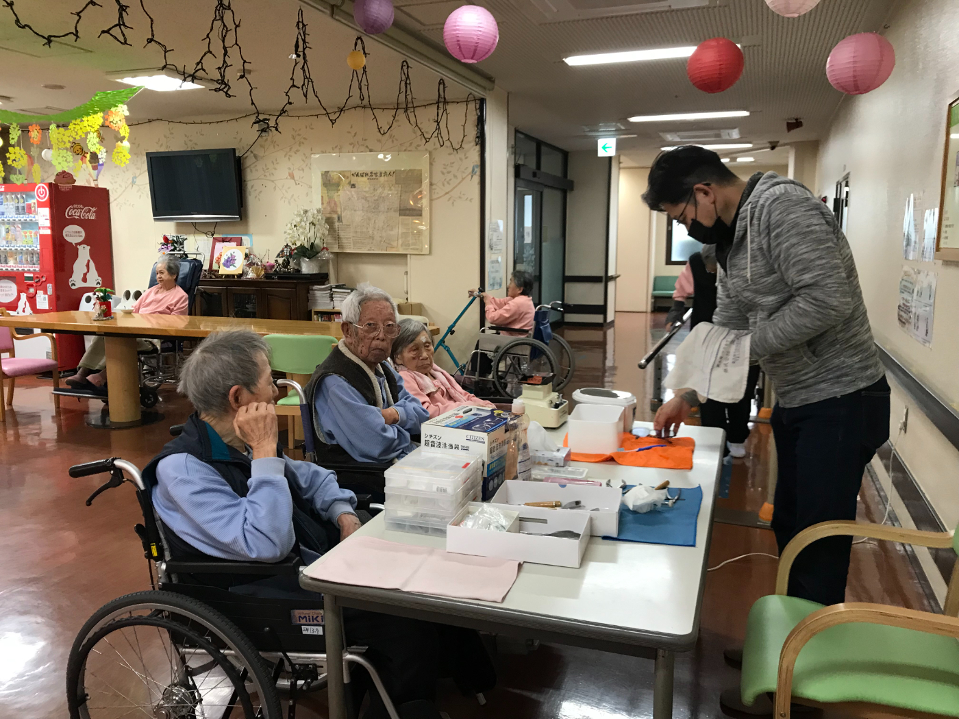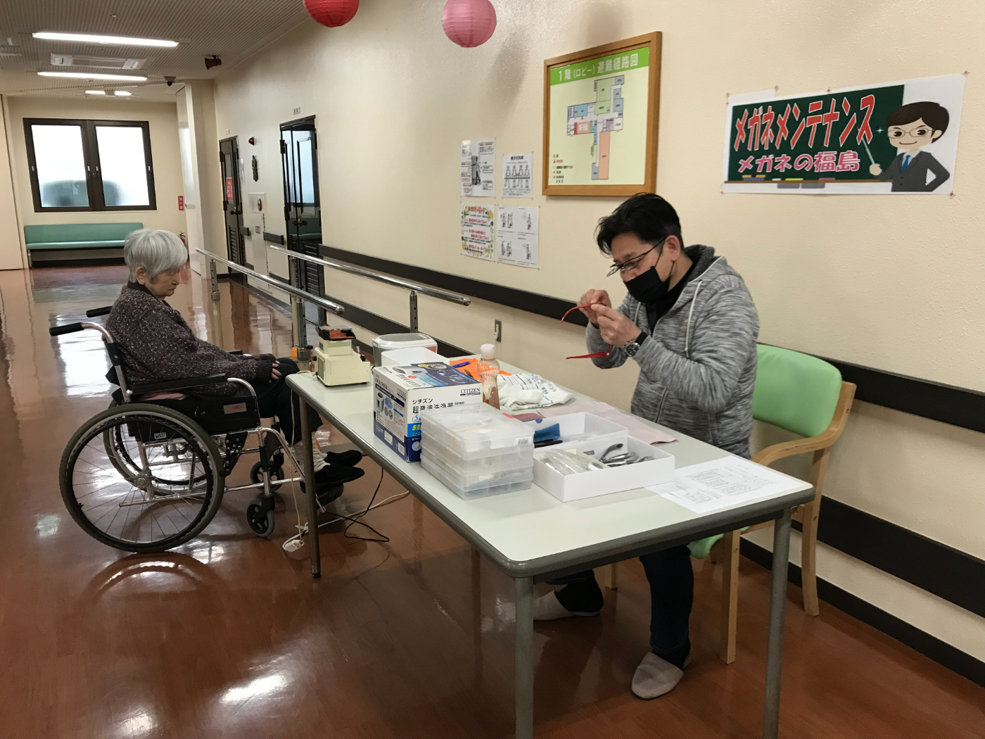 3カ月おきにボランティアでメガネの福島の店長さんがメガネメンテナンスに来てくれています。フレームの調整やメガネのお掃除まで細やかな手入れをしていただいて入所者の方々も喜んでいます。店長さんいつもありがとうございます。