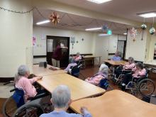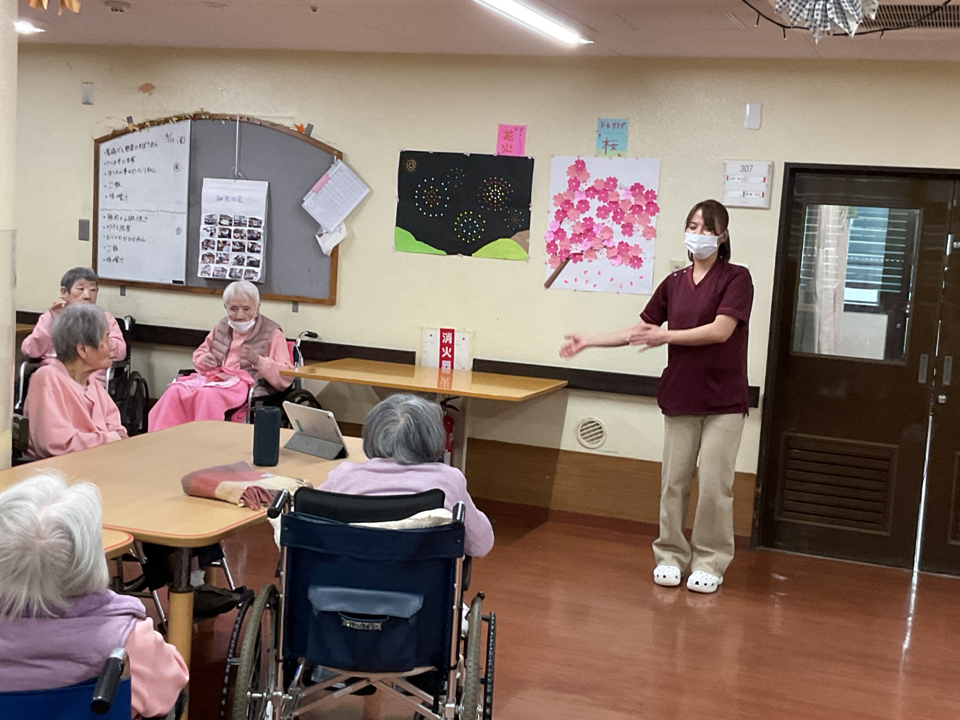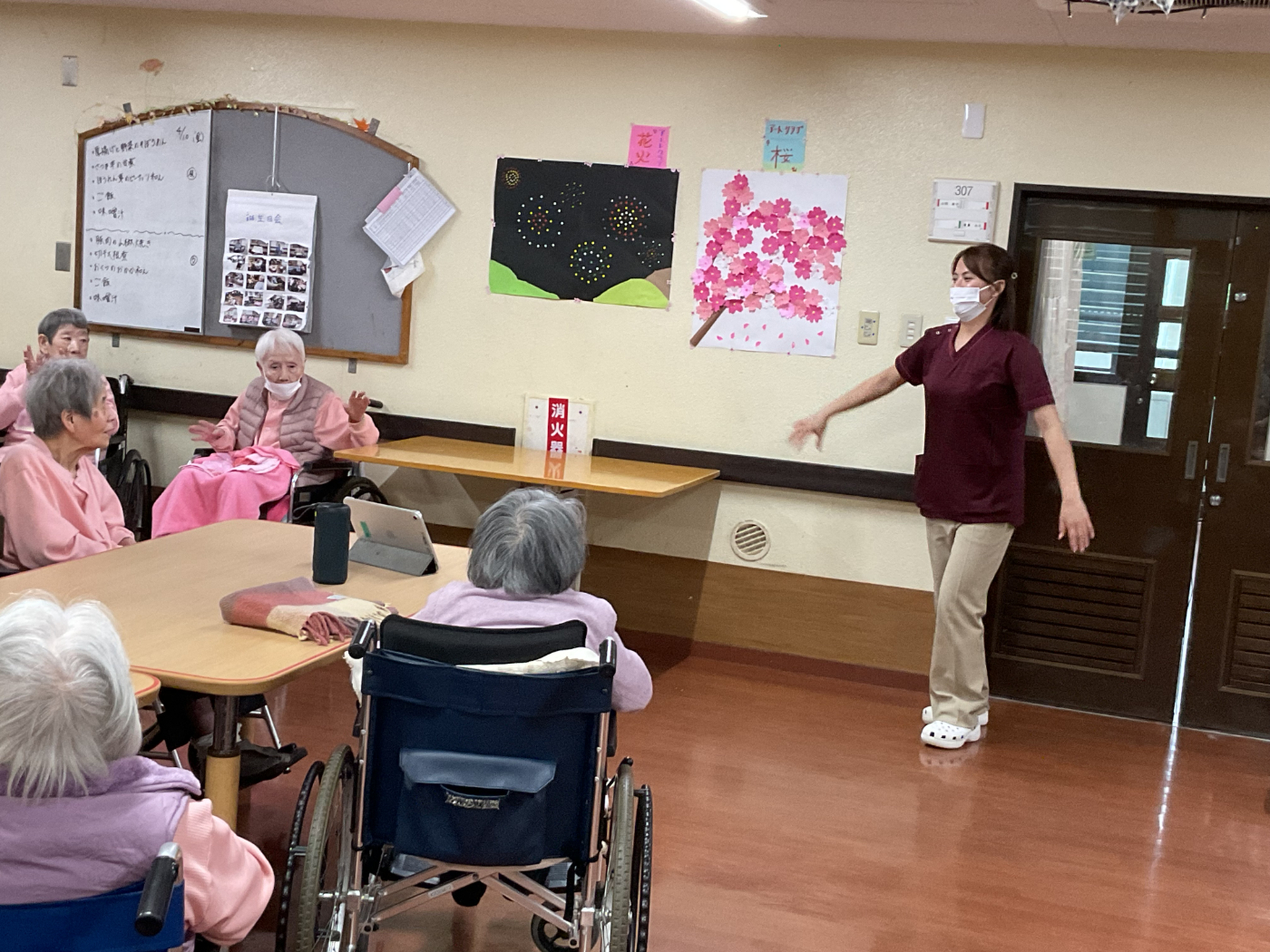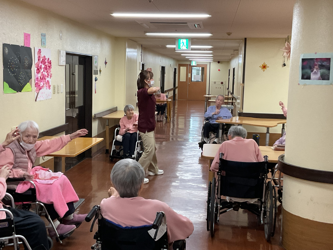昼食後のレクリエーションで介護士さんが見本になって元気よく体操をしていました。音楽に合わせることで皆さんいつもより可動域も広がり楽しんで身体を動かしているように感じました。